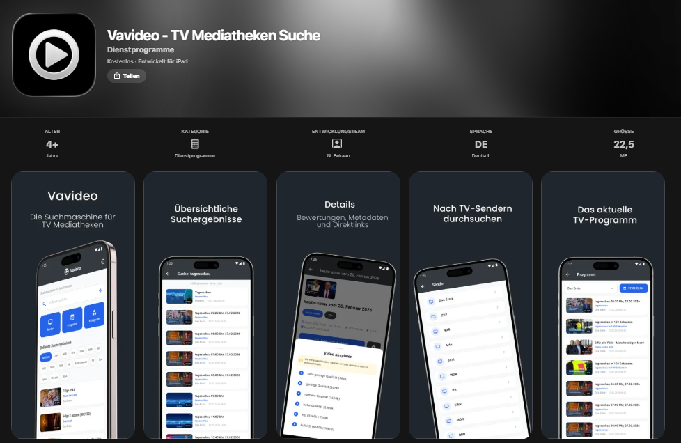 Ein schlichtes und übersichtliches Layout runden die Bedienbarkeit der App ab. Schon im Web ist Vavideo eine der führenden Mediathek Suchmaschinen und bietet seit 2012 die Mediathek-Suche in Deutschland an. Nun endlich auch als App. Pro-Tipp: Man kann die iPad-Version auch unter macOS installieren (Apple Chip Prozessor vorausgesetzt). Somit auch eine gute Alternative zu anderen installierbaren Programmen, wie MediathekView oder Mediathek.app für macOS.